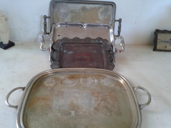 • 4 bandejas com banho, no estado, Bandejas grande medindo 50 x 40, media 42 x 33, bandeja torneada 40 x 30 , bandeira pequena com trabalho nas bordas 37 x 30