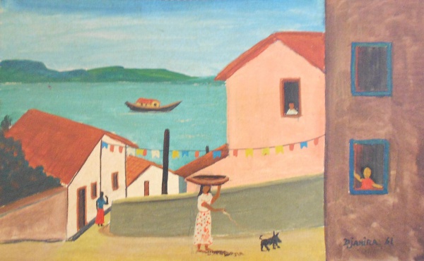 • Djanira Motta e Silva, Casario com Marinha, Óleo Sobre Cartão, 18 x 28, datado em 1961, assinatura no canto inferior direito.