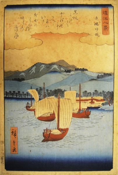 • Ando Hiroshige, `Otoko Montanhoso a Makigata na Província de Kawachi`, Xilogravura, 25 x 35, assinatura no canto inferior esquerdo.