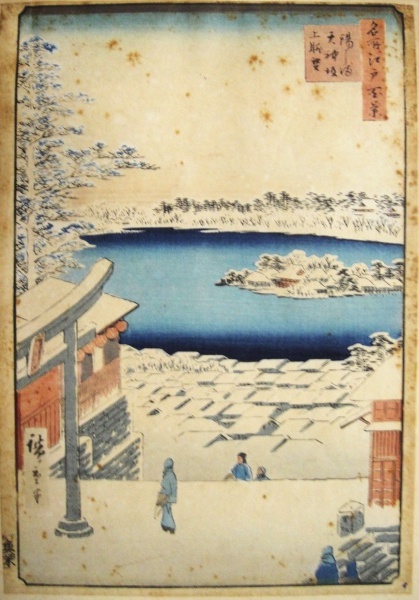 • Ando Hiroshige, `Vista em Cima da Slope no Santuário de Yushima Tejin`, Xilogravura, 25 x 35, assinatura no canto inferior esquerdo.