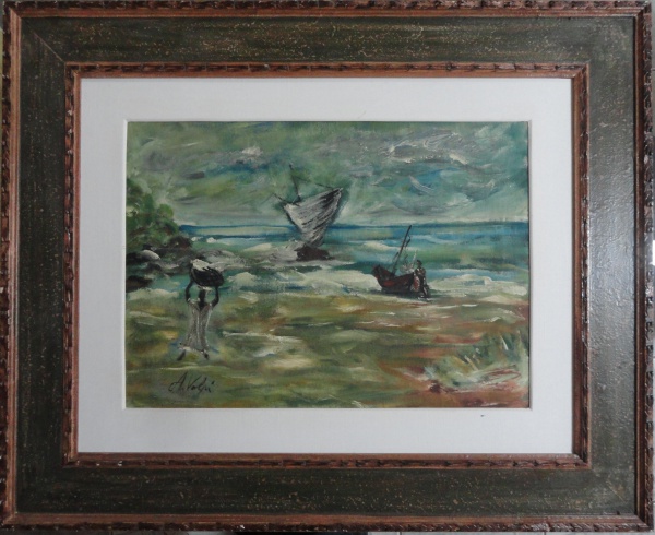 • Aldo Bonadei,  "Composição", Óleo sobre eucatex, 36 x 46, assinatura no canto inferior esquerdo.
