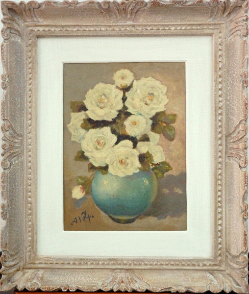 • Alfredo Volpi, `Flores, OST COLADO SOBRE MADEIRA`, Óleo sobre Tela, 30 x 40, datado em 1940, assinatura no canto inferior direito.